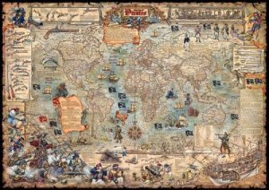 Nástěnná mapa pro malé piráty v anglickém jazyce je plná ručních kreseb pirátů, tak jak je známe, či spíše jak si je představujeme - s páskou přes oko, dřevěnou nohou a s papouškem na rameni... Nechybí ani kresby pirátských pušek, šavlí, kanónů s různými typy munice, pirátské vlajky, průřez lodí apod. Vše s podrobným popisem. Mapový podklad zobrazuje reálné údaje, současné politické rozděnení států, názvy měst, řek, významných pohoří, ostrovů apod.