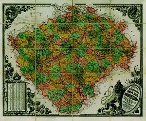 Velká reprodukce krásné mapy českých zemí z roku 1883 českého kartografa, geodeta a statistika Josefa Erbena.