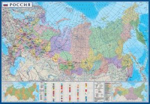 Nástěnná mapa Ruska v extra silném laminu. Ve spodní části mapy jsou tématické mapky časových pásem a federálních okruhů (administrativní rozdělení), vlajky správních celků RF. Na mapě najdeme silniční a železniční síť, přístavy, letiště.